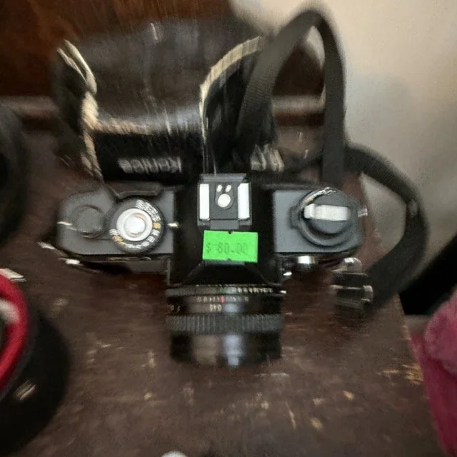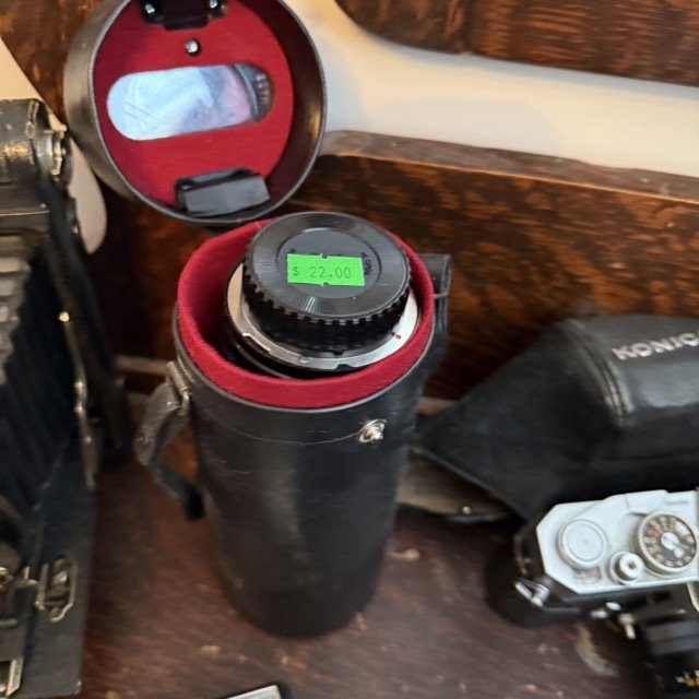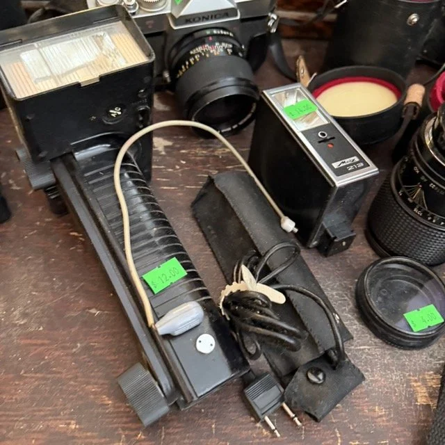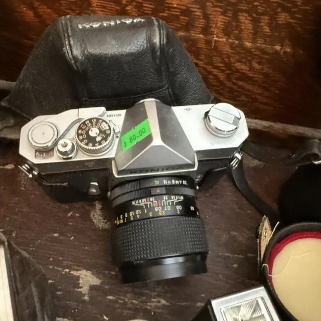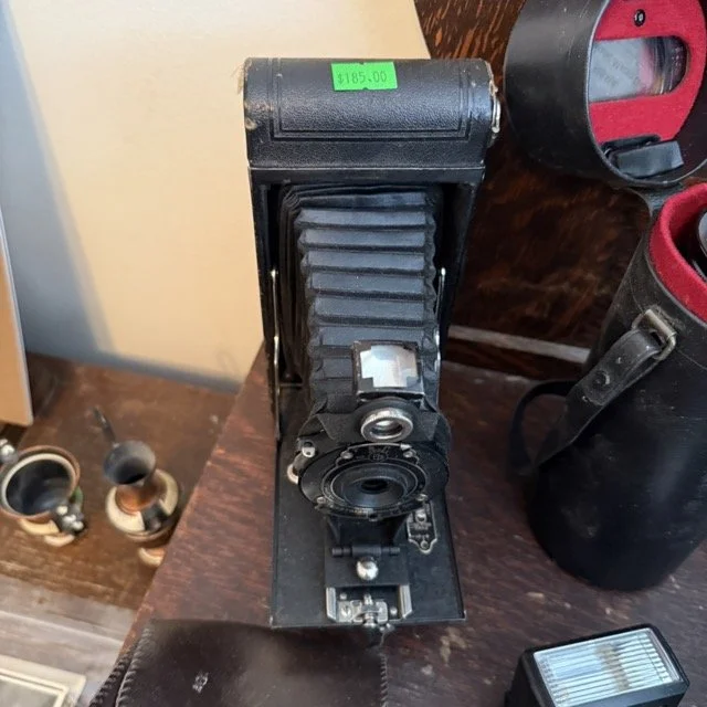 Vintage camera and lens collection including a vintage Konica Autoreflex T3 35mm film camera, an antique Kodak No. 3A Folding Cartridge Hawkeye camera $185 and more!