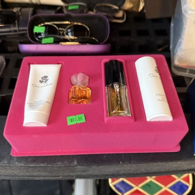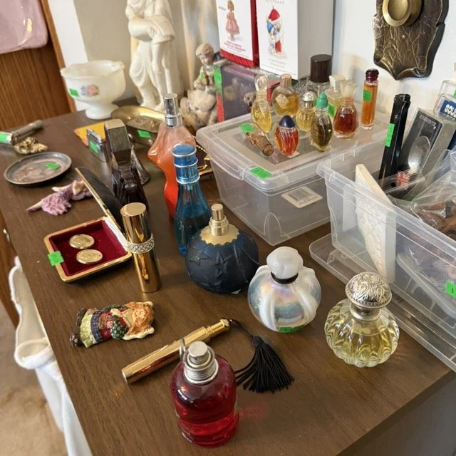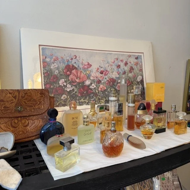 Vintage name brand perfume collection with names like Coco Chanel, Giorgio Armani, Elizabeth Arden, Paco Rabanne and more