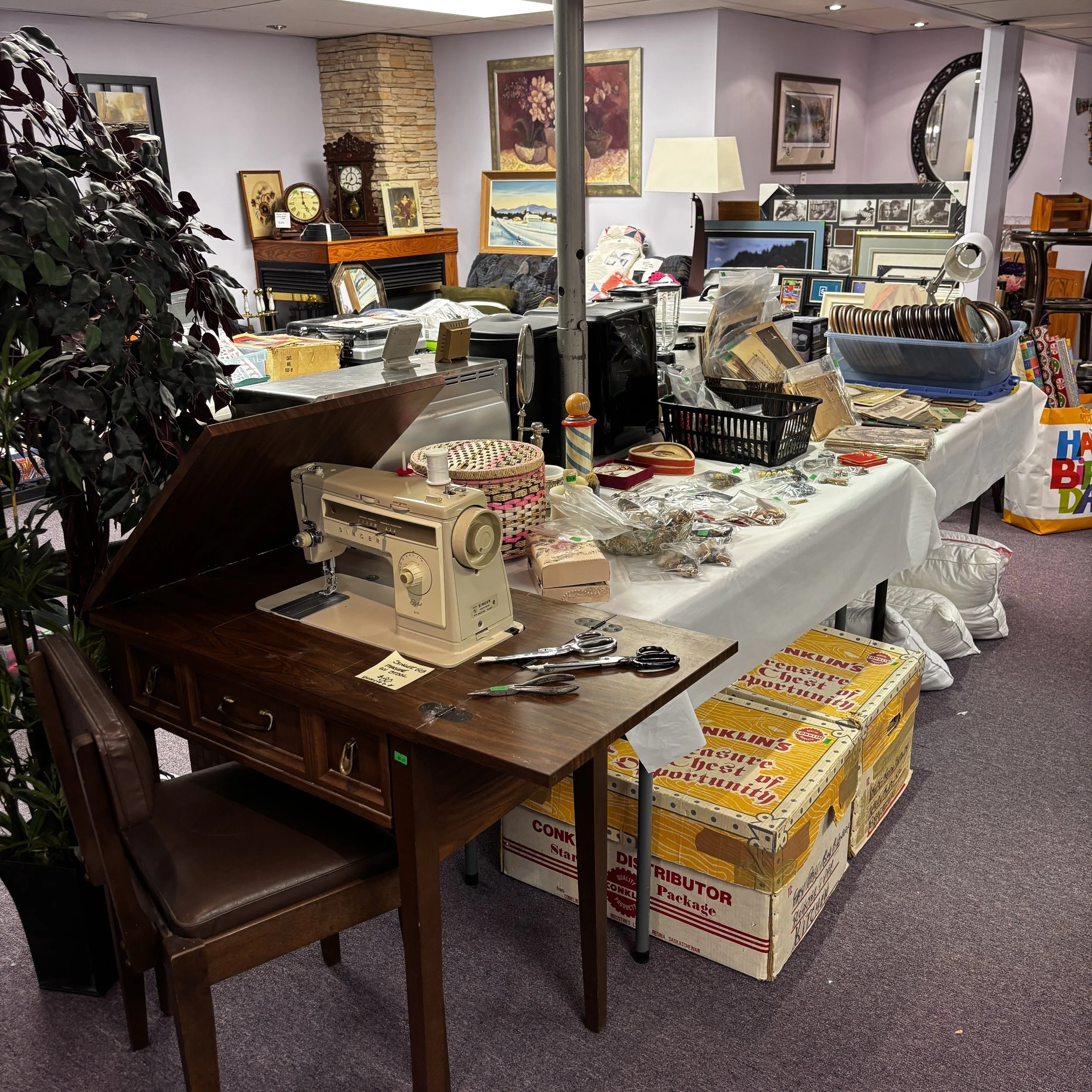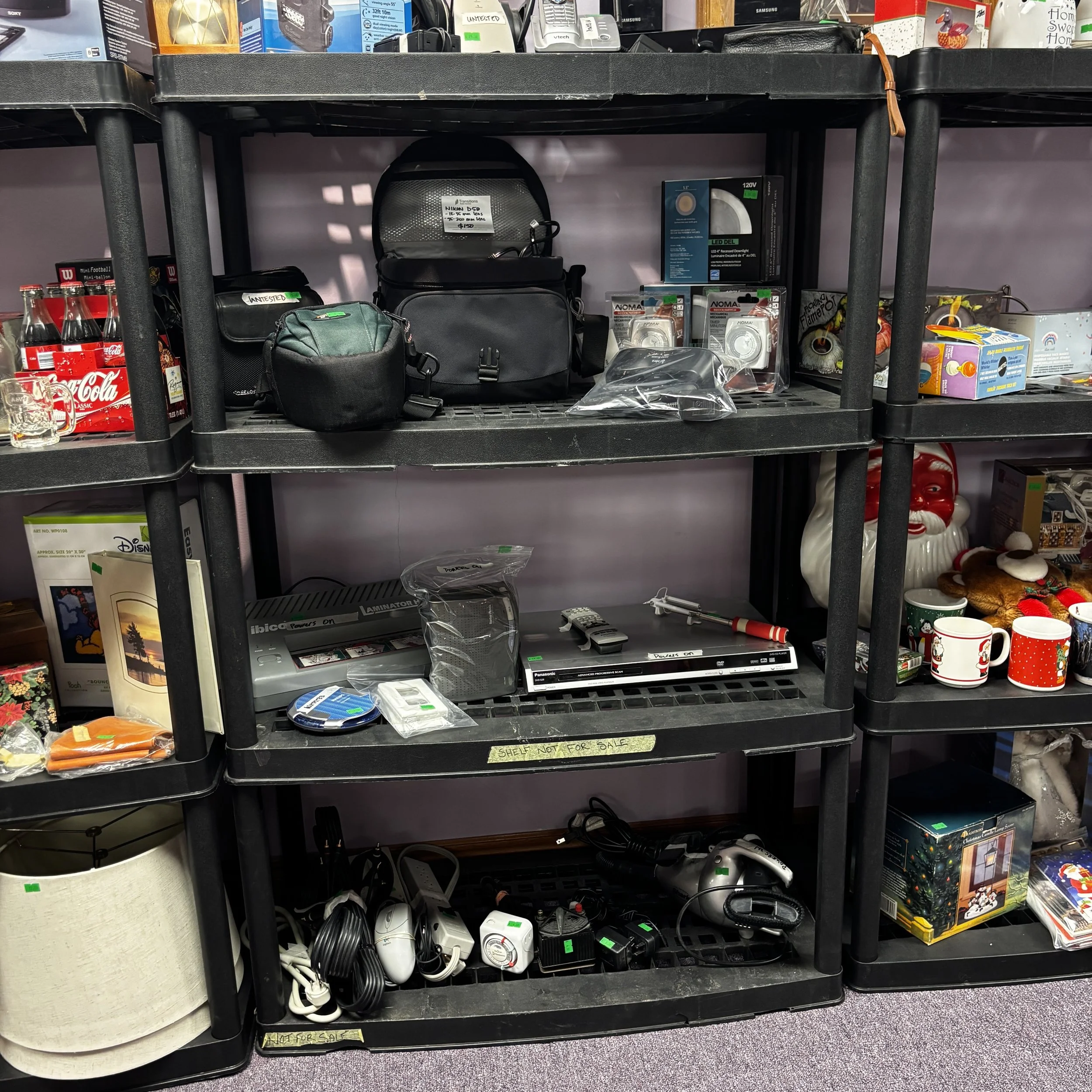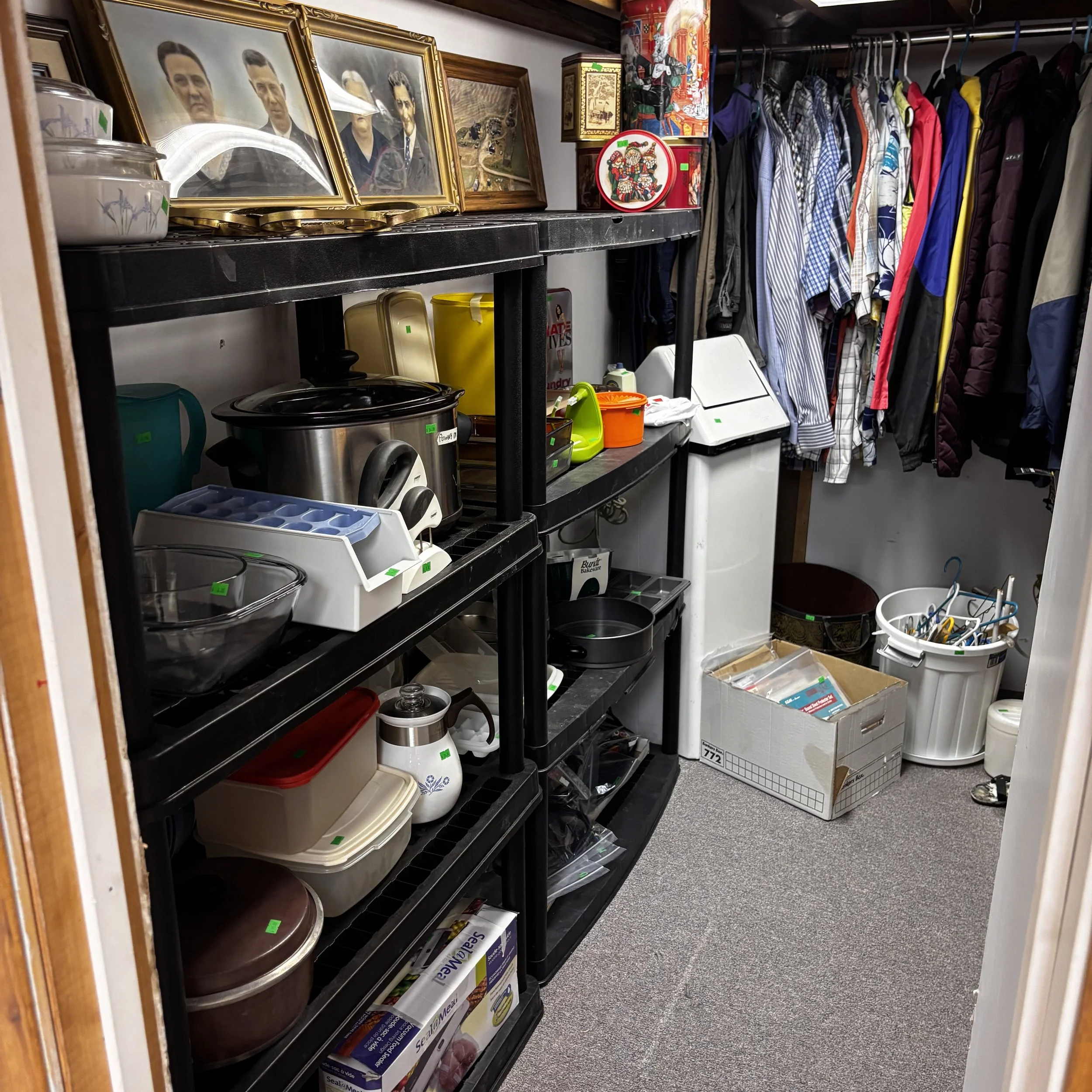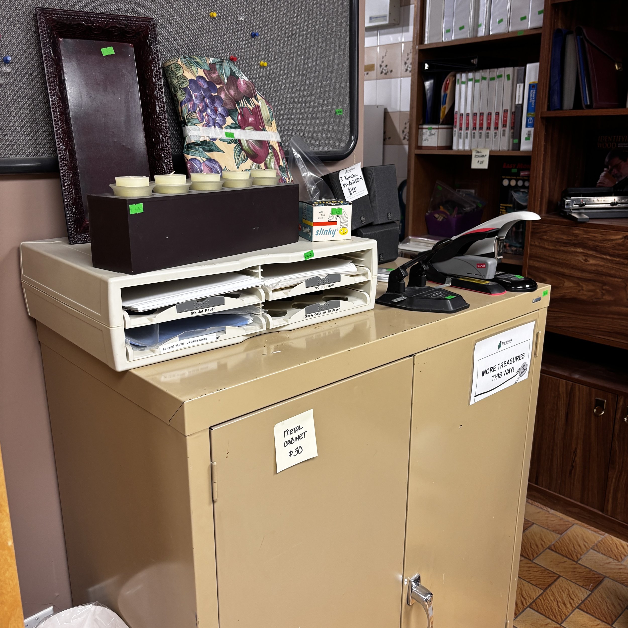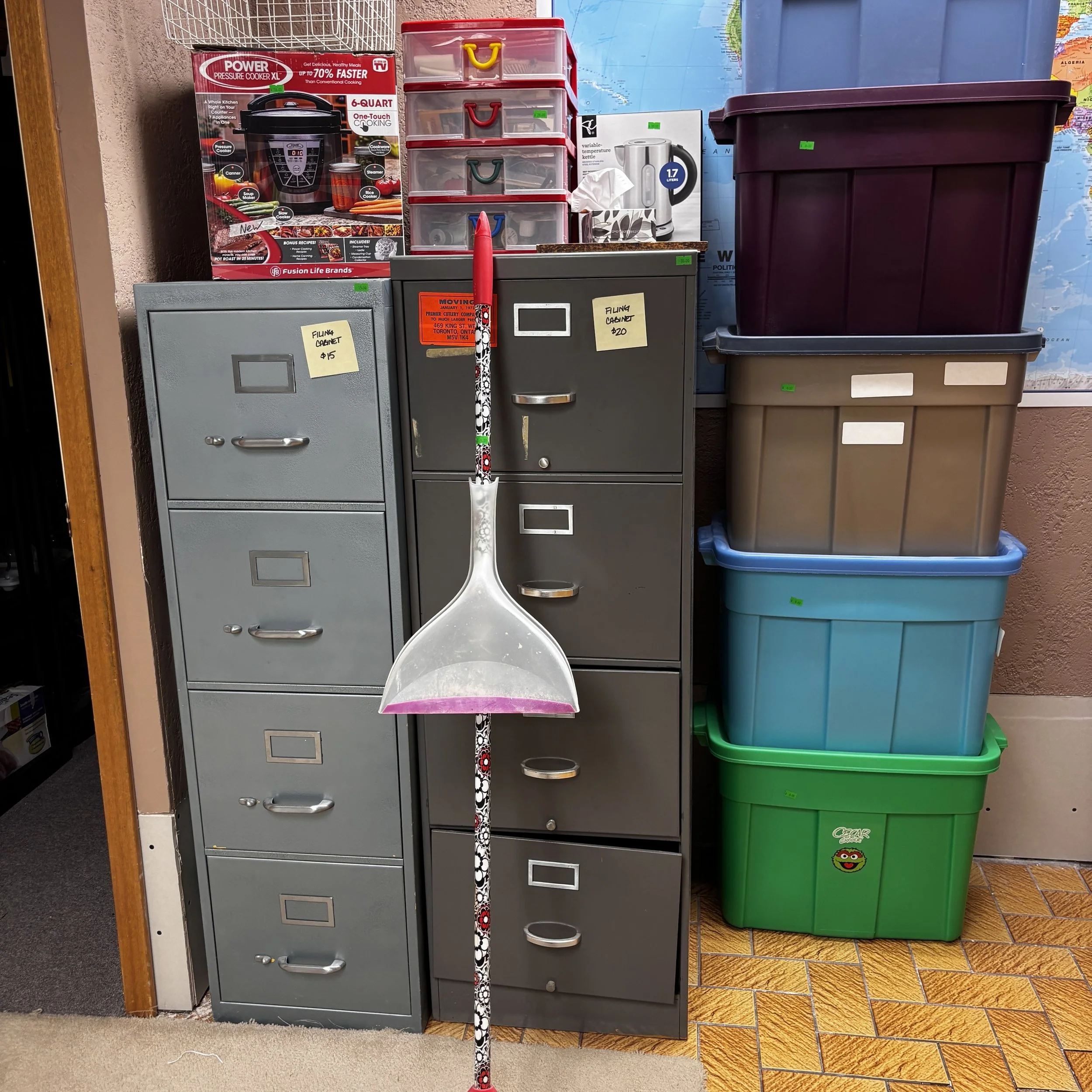 There is also tons of modern day furniture, household supplies and decor as well as a room full of office supplies. There are also several bookshelves, wardrobes and storage cabinets available!